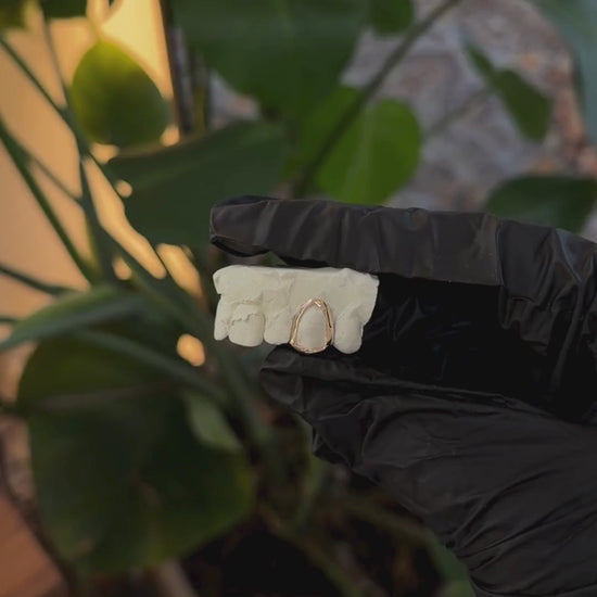 Add a touch of edge with a simple single open faced gold cap. These can be made for any upper or lower tooth. Handcrafted from high-quality gold, this removable gold tooth cap fits securely over your natural tooth for a comfortable accent without permanent modification.